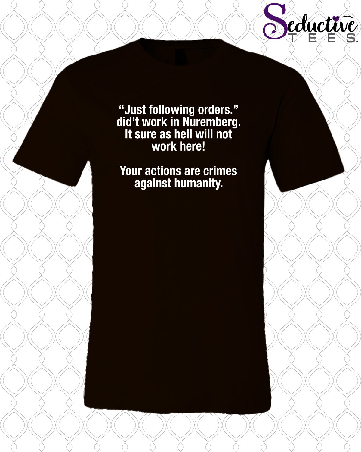 “This soft-style tee is a reminder that ‘just following orders’, the excuse echoed at Nuremberg, has no place in a free society. Here in the U.S., we’re responsible for recognizing when authority crosses the line, and for standing up, peacefully, boldly, and unapologetically, against the rise of fascism. Freedom survives only when ordinary people refuse to surrender their conscience.”